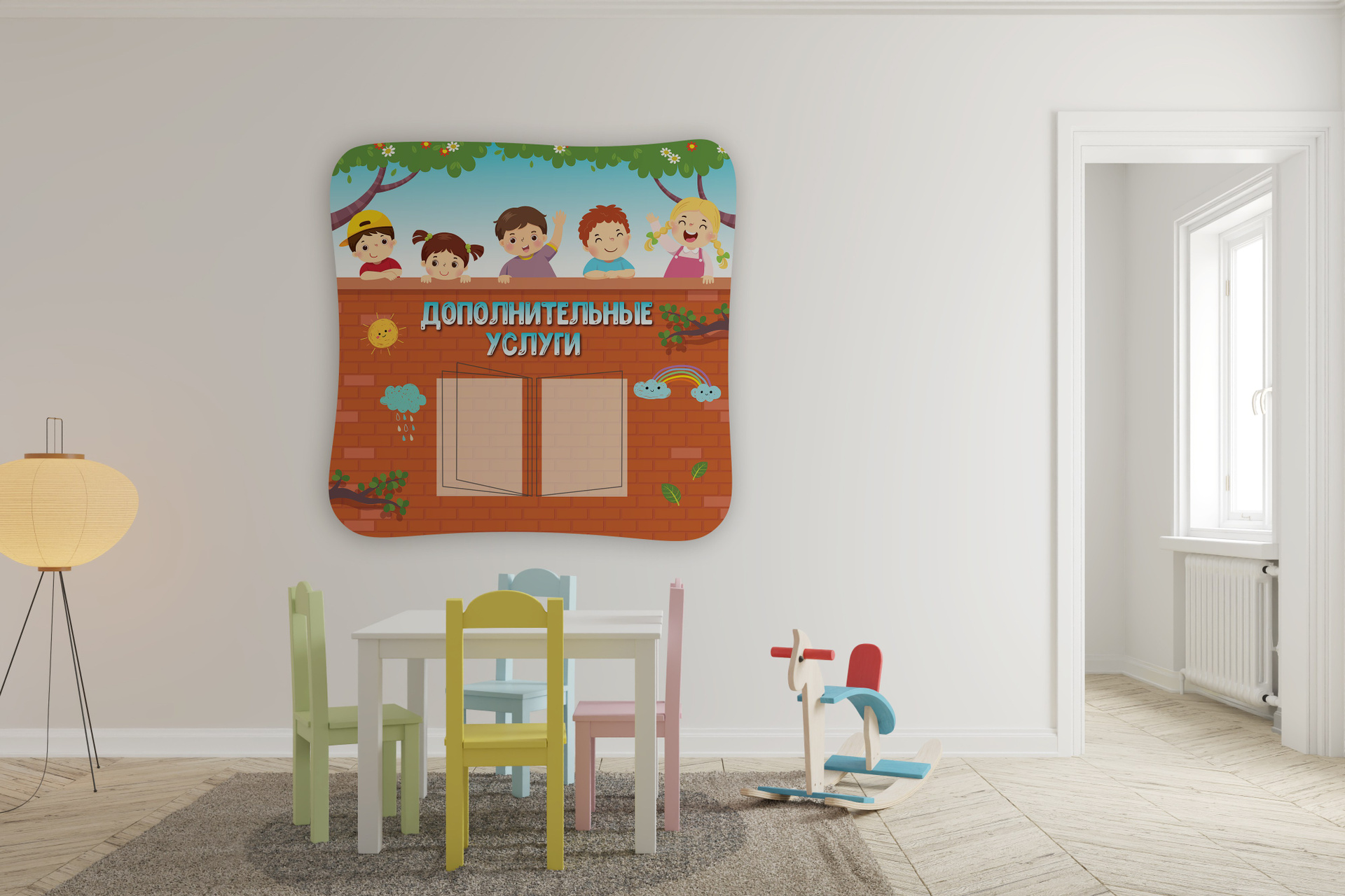 Удобный способ размещения важных объявлений и наглядных материалов. Он помогает структурировать информацию, поддерживает порядок и гармонично вписывается в интерьер школы или детского сада, сохраняя аккуратный и современный внешний вид.